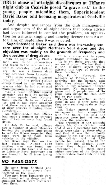 Northern soul in Coalville actually occurred in two different time periods. In 1975, Coalville Tiffanys ran an all-dayer and an all-nighter, which closed and re-opened, only to close again. On both occasions, the closure was the result of the local authorities objecting to the licence due to alleged drug abuse.